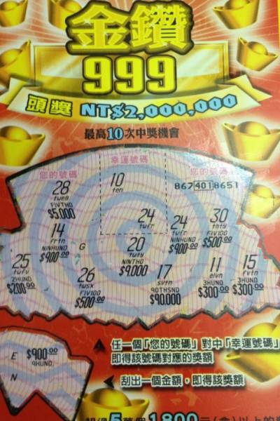 討論版列表 » 刮刮樂討論版 » [分享] (10-02) 金鑽900x2 回應本話題 發表新話題