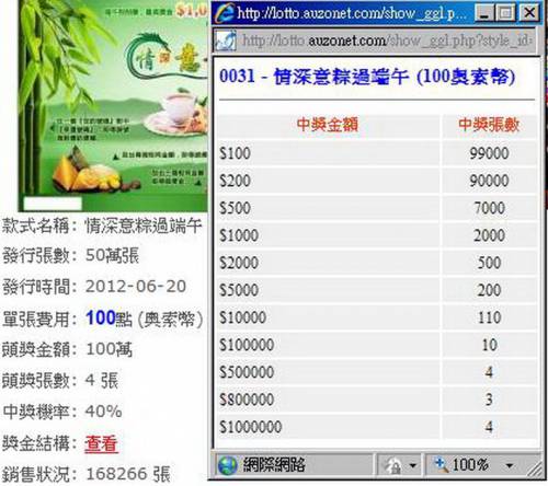 2012/11/21 23:42:53 刮刮樂中獎獎金 $100 奧索幣 刮刮樂編號:0031-396829