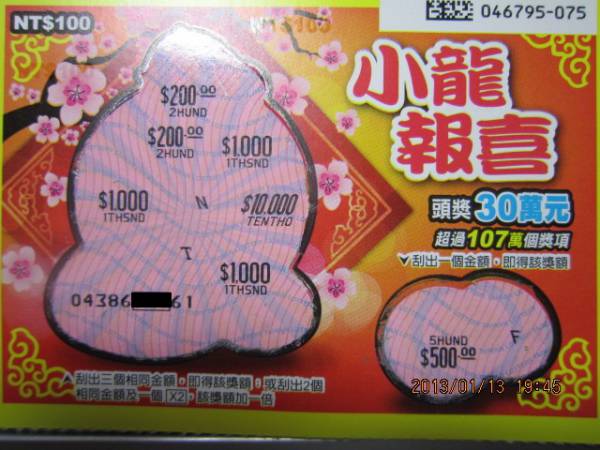 討論版列表 » 刮刮樂討論版 » [分享] (01-13) 小龍報喜 FTN 回應本話題 發表新話題