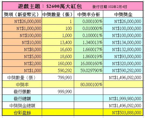 討論版列表 » 刮刮樂討論版 » [分享] (01-30) 26000000元大紅包獎金結構分析