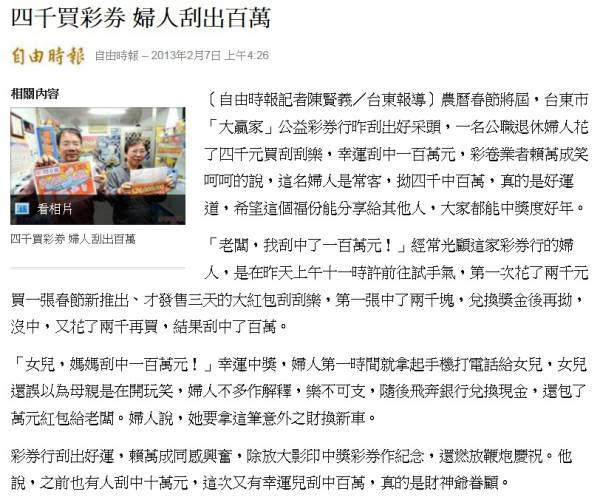 [分享] (02-07) 四千買彩券 婦人刮出百萬