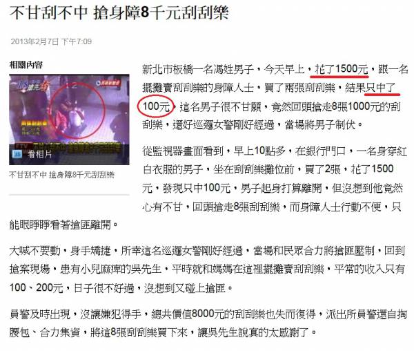 [分享] (02-08) 不甘刮不中 搶身障8千元刮刮樂