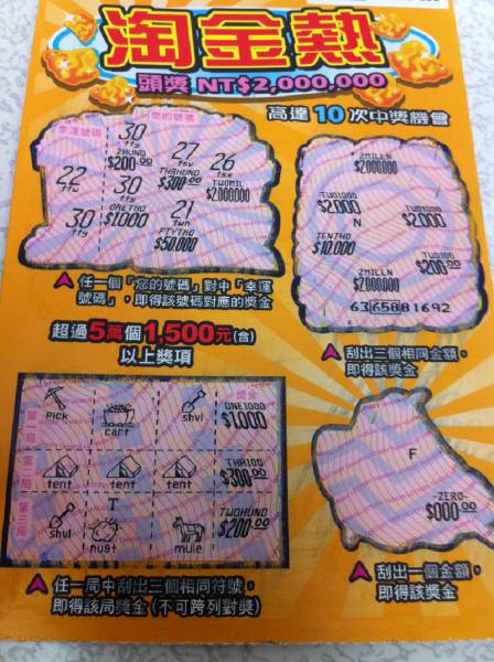 這張淘金熱刮出1500元, 連彩券店老闆娘都有點驚訝, 因為在櫃子裡剩下幾張而已, 他記得這本超過1000元以上的已經被刮出幾個了.......