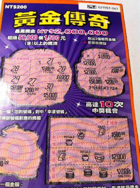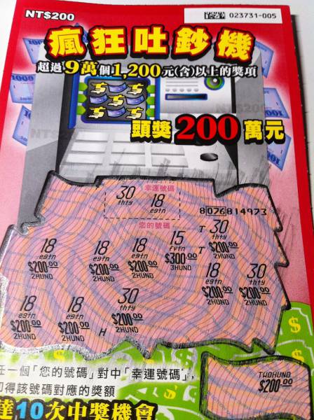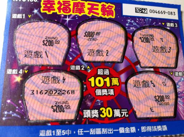 今天中午迎戰本檔刮刮.....先在一家彩券行花1000元,買8張幸福摩天輪及1張黃金傳奇......只刮到這張800元和一張100元
