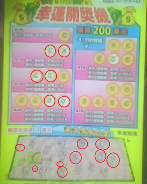 昨天選擇下午五點到七點收錢好日子的吉時去買, 一開始二張400沒中, 想說第三張選別人留的中1200後, 收1000,用200再挑別人留號碼中1500, 真好運, 又刮2張400不中, 買大樂透電腦選號二張100元收手.