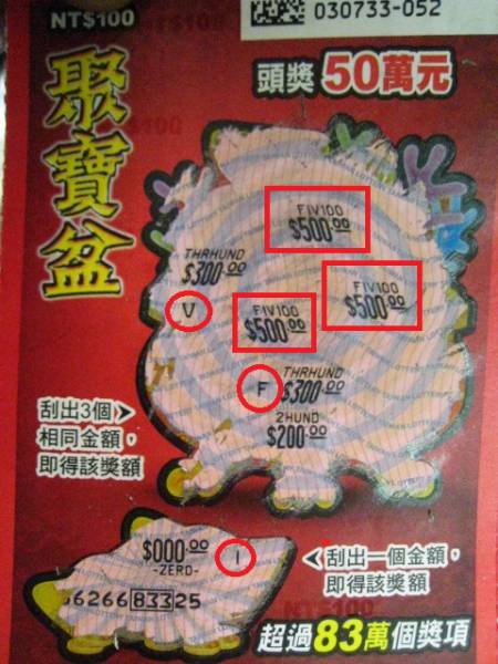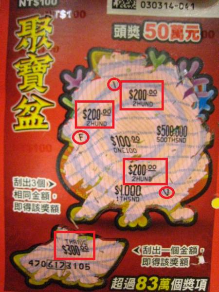.今天下午去路邊賣刮刮挑散的,選五張100元中4張1700,扣之前刮200三張沒中, 及之後用二張中100去刮沒中,小WIN 900.