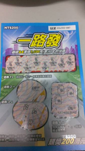 之後今晚邀同研究室的學弟妹跟學長吃飯,大家都出200其他我出~之後有個阿婆走過來賣,學長就問我要不要玩,本想說中午輸了不完~但學長慫恿之下還是跟他合買一張超級777然後就先中200~想說打平就好,然後阿婆又立馬拿出一張一路發~好吧在玩~然後就先刮右下角連續三個發200+英文符號T想說是TWO沒了結果第二區又中200!在刮最上面的8真的是一直8下去啊~最後中2000!這頓的錢有了~好爽~