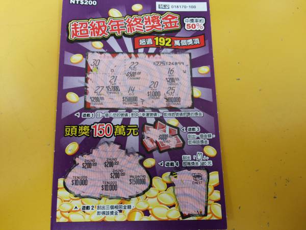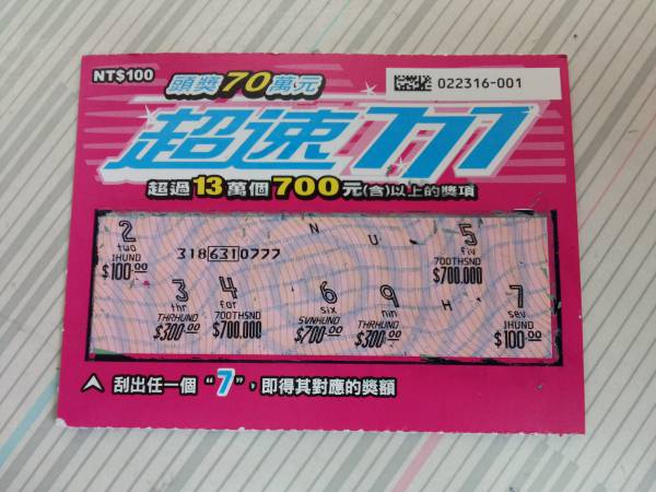 再換一張超速777中一百,一張熱刮600...沒中,運氣用完了