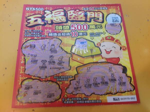 第一張 中500 第二張 中500 第三張 慘賠 第四張 中2000 第五張 慘賠