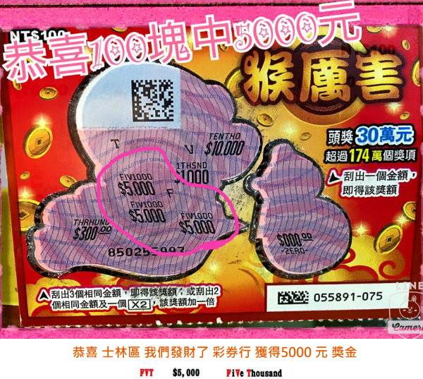 恭喜我們發財了 彩券行 獲得猴厲害 5000元獎金