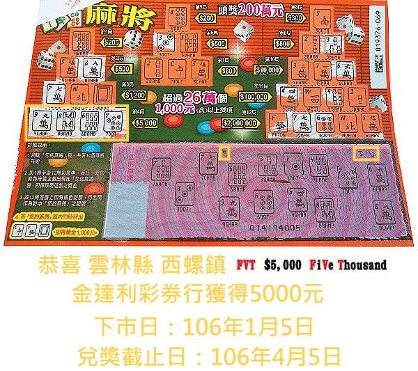 麻將2016年中 5000元FVT(恭喜 雲林縣 西螺鎮金達利彩券行獲得)