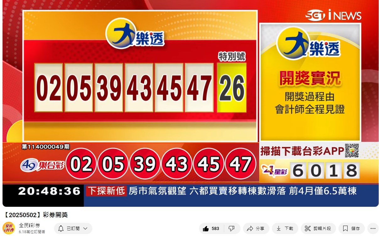 備註: 台彩因給全民兌獎方便,會在電視節目播完後,於全民i彩券YT官方頻道