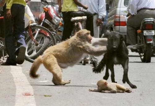 在印度首都新德里的街頭,人們經常能夠看到猴子撿東西吃的景象。當日,這只小猴子不幸被一輛快速穿過的電動車撞傷,隨後又被附近遊蕩的一條野狗發現。就在猴寶寶即將葬身犬口時,猴媽媽勇敢地衝了上去,與野狗廝打在一起,它跳上野狗的背,瘋狂地撕咬對方直至將其趕跑。