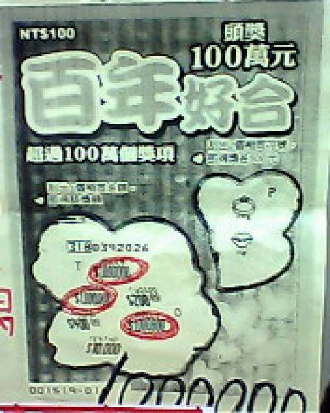 這是3天前 !!在我眼前閃過~~只剩下2張放在櫃台前的百年好合.....居然一個男的進來~~就括那2張~~其中一張就中了 .... 恨阿 )))為什麼不是我啦 ~~~PO圖上來跟大家分享 !!不鼓勵大家狂括 !!因為~~會中.....幾張就中了 !!有錢括幾張 ~~其他放在口袋~~新台幣很好用的