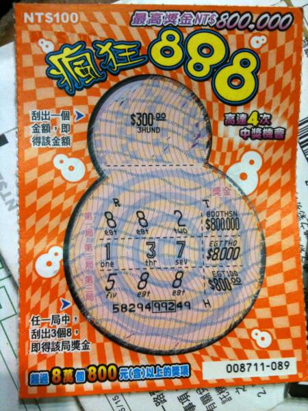 討論版列表 » 刮刮樂討論版 » [分享] (10-18) 不怎麼樣的瘋狂888獎金NTD300