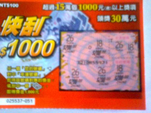 我今天休假我去彩卷行買ㄋ3張快刮1張沒有中,中2張1張100元.第2張中ㄋ1000元,還是全壘打